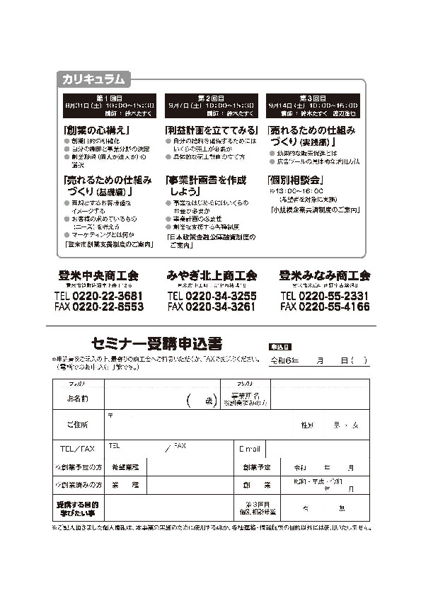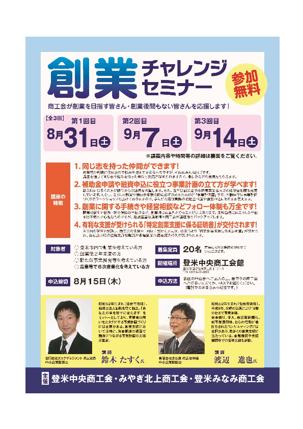 登米市内の3商工会合同で創業チャレンジセミナーを下記のとおり開催します。