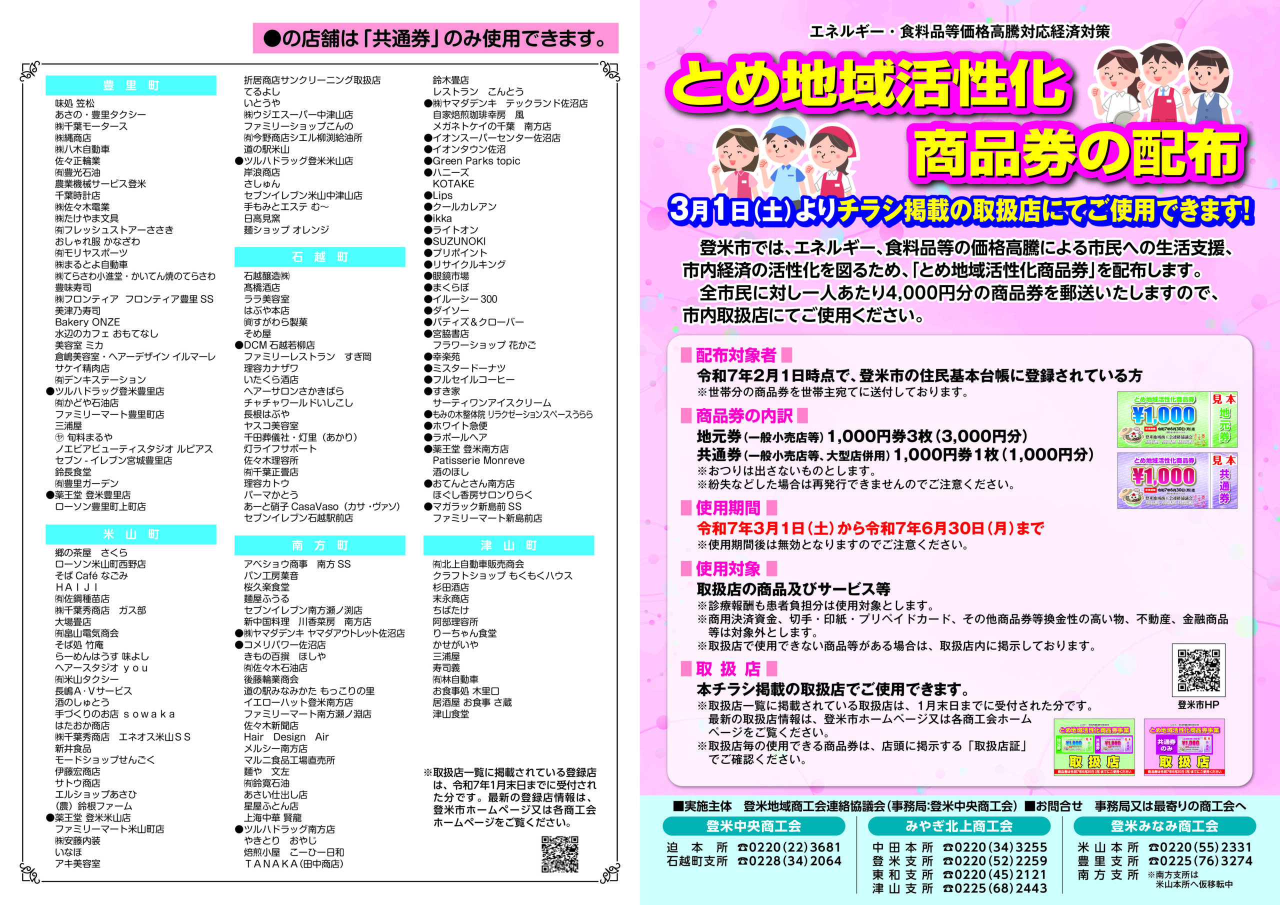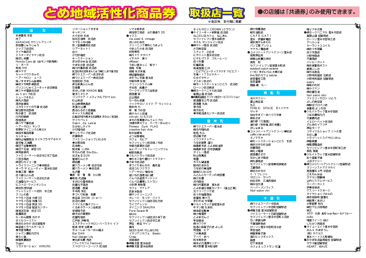 とめ地域活性化商品券事業取扱店(令和7年5月2日現在)の一覧表を掲載いたします。 商品券は、令和7年3月1日~令和7年6月30日まて使用できます。 ※取扱店毎に使用できる商品券(地元券・共通券)が異なりますので、取扱店一覧表でご確認をお願いします。 ●の店舗は「共通券のみ」使用できます。その他の取扱店舗では、「地元券」「共通券」の両方が使用できます。 尚、取扱店店頭に掲示されている「取扱店証」でも確認できます。 FacebookXBluesky